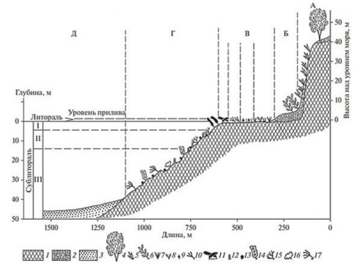 Элементы рельефа: отмерший клиф (А), аккумулятивная терраса (Б), литораль (каменистая осушка) (В), сублитораль: пояс скал (Г), песчаная отсыпь (Д). Подразделения сублиторали: верхний этаж (I), средний этаж (II), нижний этаж (III).
