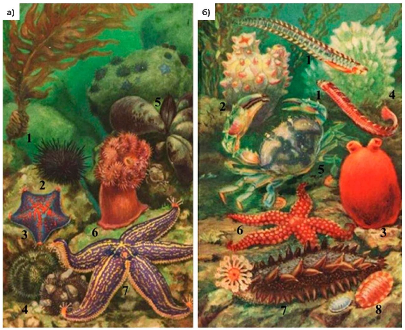 а) 1 — водоросль ундария перистая (Undaria pinnatifida), 2 — черный морской еж (Mesocentrotus nudus), 3 — гребешковая патирия (Patiria pectinifera), 4 — серый морской еж (Strongylocentrotus intermedius), 5 — мидия Грея (Crenomytilus grayanus), 6 — губка (Metridium senile fimbriatum), 7 — амурская морская звезда (Asterias amurensis); б) 1 — рыбы-маслюки, 2 — асцидия бугорчатая (Halocynthia roretzi), 3 — асцидия пурпурная (Halocynthia aurantium), 4 — тихоокеанская устрица (Rassostrea gigas), 5 — песчаный краб-плавунец (Liocarcinus holsatus), 6 — морская звезда (Ligia cinerascens), 7 — дальневосточный трепанг (Apostichopus japonicus), 8 — панцирный моллюск хитон