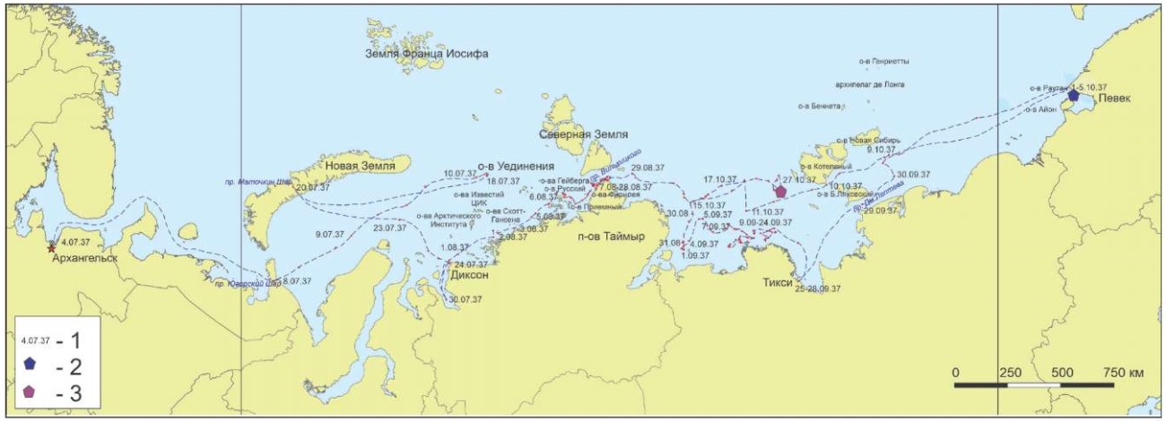 Fig. 3. Navigation route of the Malygin icebreaker steamship in 1937 from the moment of departure from the port of Arkhangelsk until wintering; the route is reconstructed according to the coordinates and description from the voyage report of captain A.G. Korelsky [12]. The dots indicate the voyage report coordinates. 1 — dates, 2 — location, where the expedition crew, including students from the Hydrographic Institute, transferred aboard the Kuznetskstroy steamship; 3 — location of wintering together with Sadko and Georgy Sedov icebreaker steamships