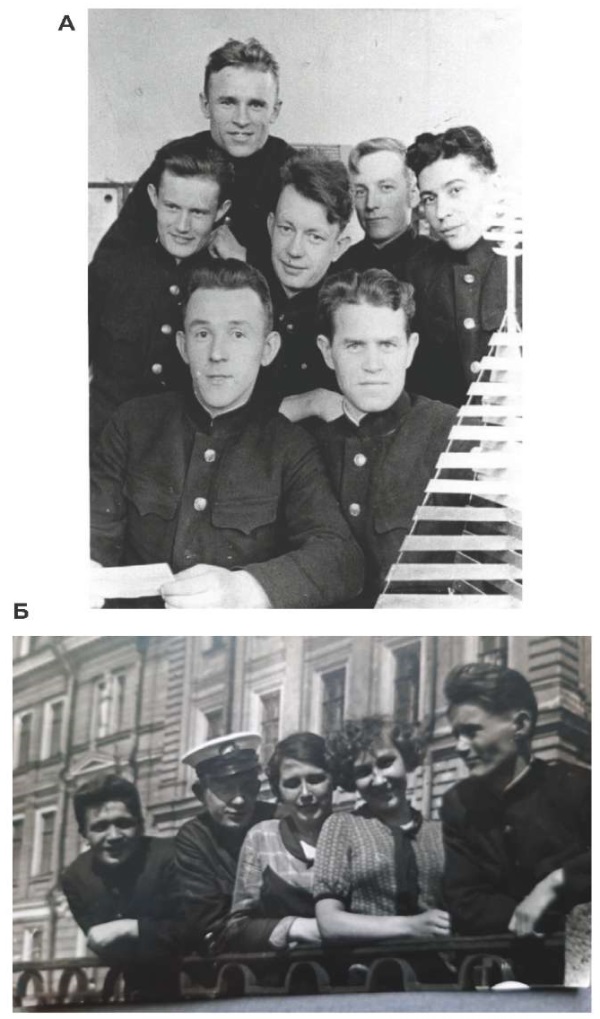 Fig. 6. Graduates of the Hydrographic Institute, July 1938. A — from left to right, bottom row: A.I. Postnikov and G.S. Krutov; second row: N.D. Dmitriev, N.P. Maltsev, G.E. Lantsetov and G.V. Koloskov; top row: V.Ya. Kalin. Б — Leningrad, June 1938 (from left to right, excluding women): D.K. Sheremetyev, N.P. Maltsev and N.D. Dmitriev (photo from the author’s family archive)