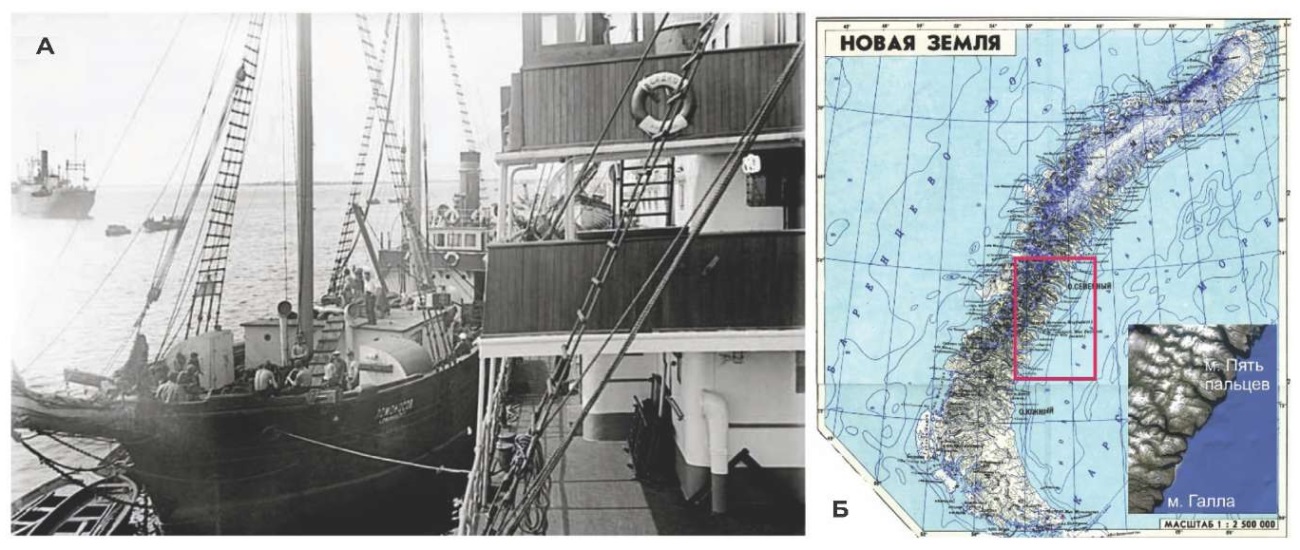 Fig. 1. Lomonosov schooner in Arkhangelsk [polarpost.ru/forum] (A) and a map of Novaya Zemlya depicting the site of hydrographic surveys in 1936 (Б)